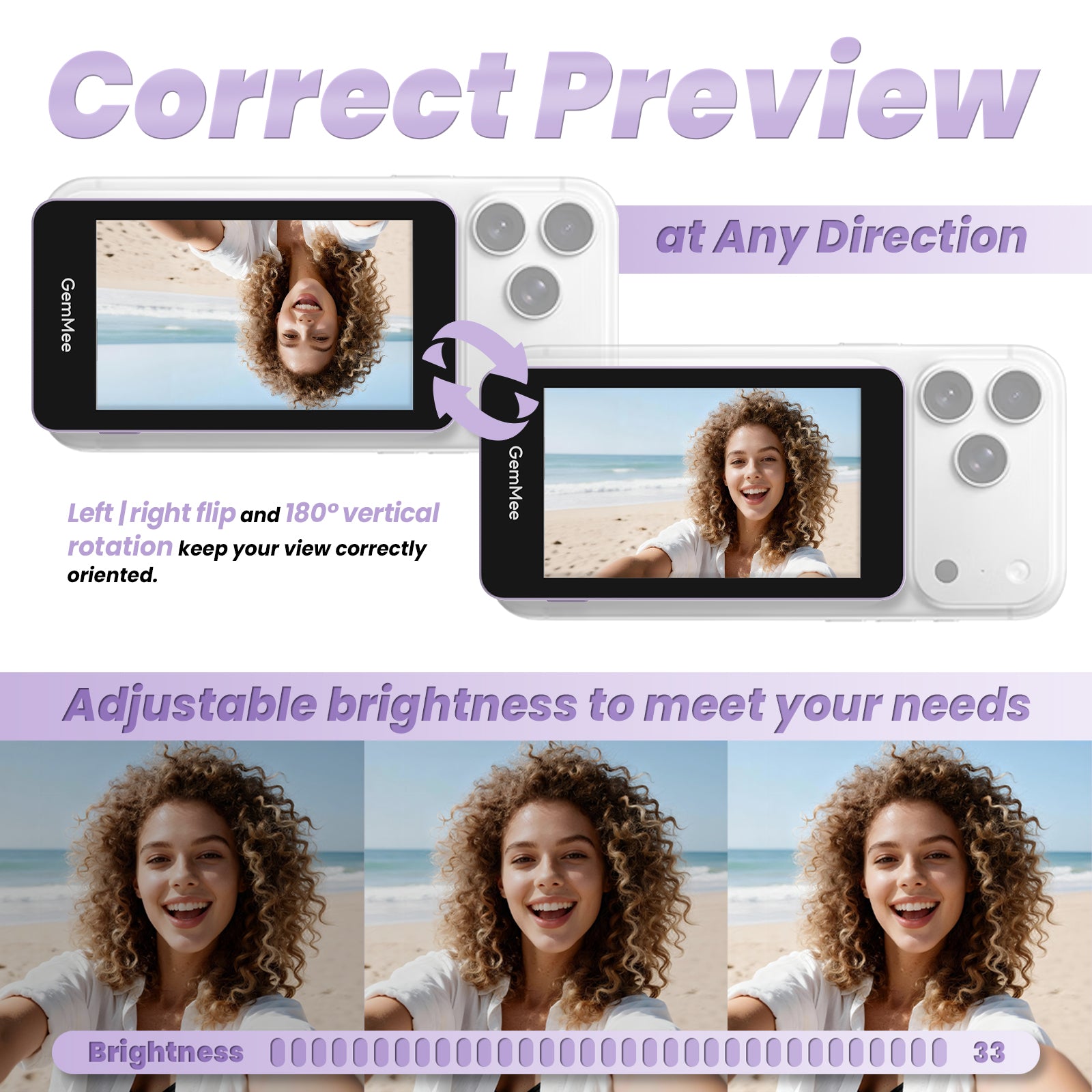Mirror display and a 180°flip make it simple to switch between vertical videos for shorts and reels and horizontal videos. The mirrored view also ensures your selfie preview looks the way you expect on screen. With 33 brightness levels, the monitor stays easy to see, even on bright, sunny days.